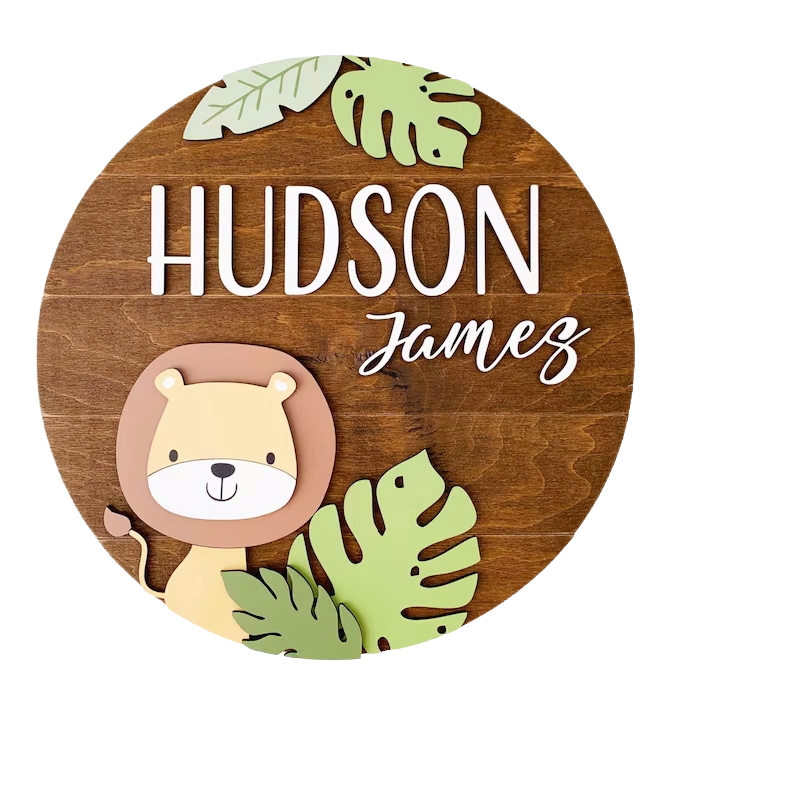 A personalized nursery name sign featuring a lion design with layered details. Custom made with your child’s name as a charming nursery wall accent.