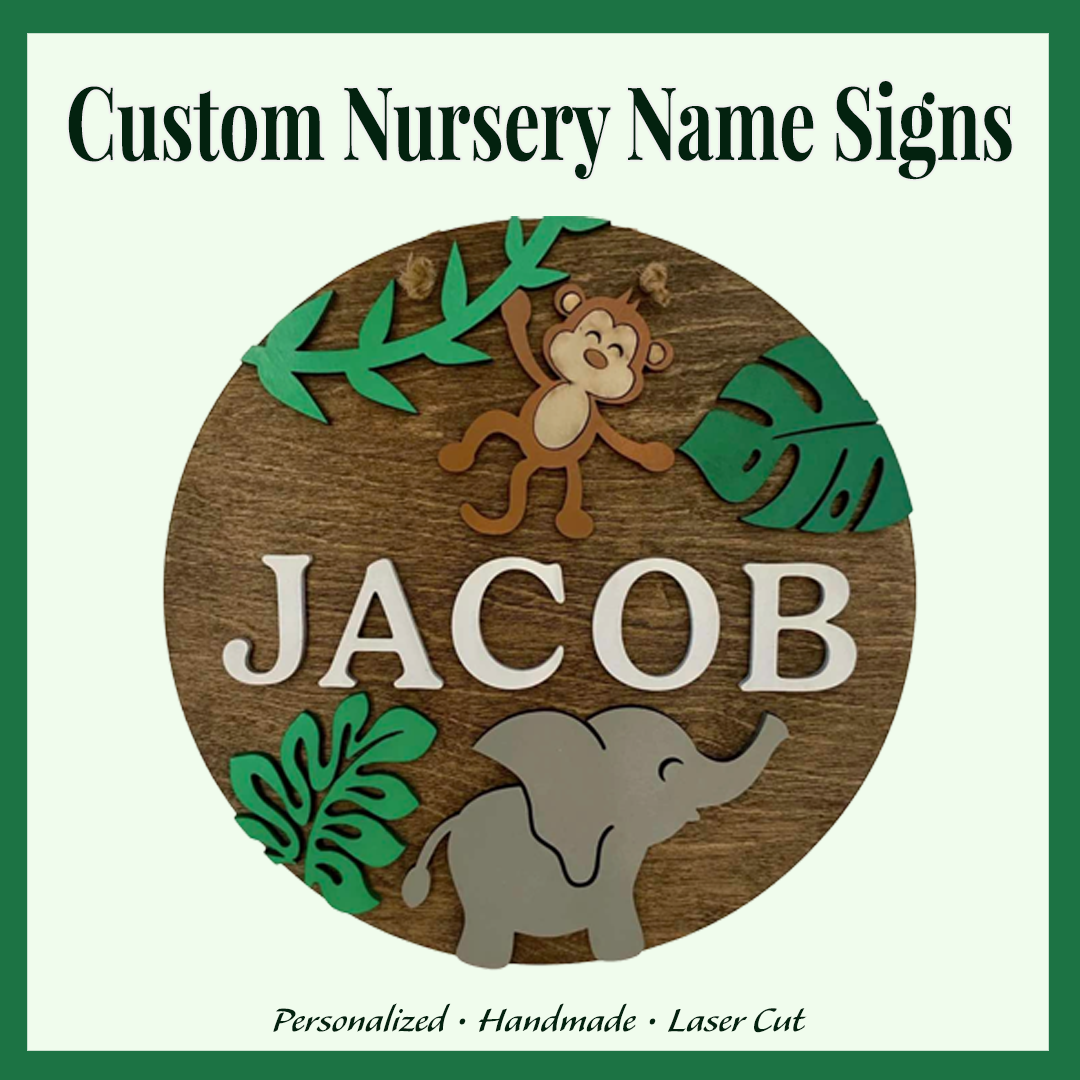This personalized nursery name sign features a monkey, jungle theme with layered details for a playful nursery look. Customized with your child’s name and wall mounted, it’s perfect for safari, jungle, or dinosaur-inspired rooms.