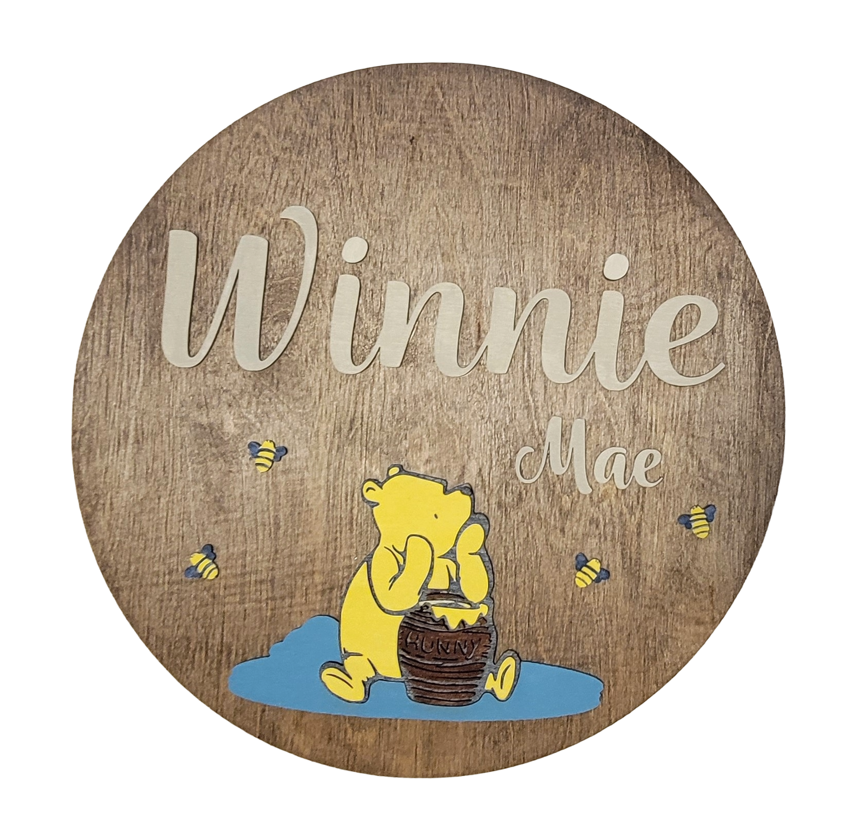 Create a cozy, storybook nursery with our Winnie the Pooh personalized baby name sign. With warm colours and a sweet honey theme, it’s a timeless keepsake and a wonderful gift for new parents.