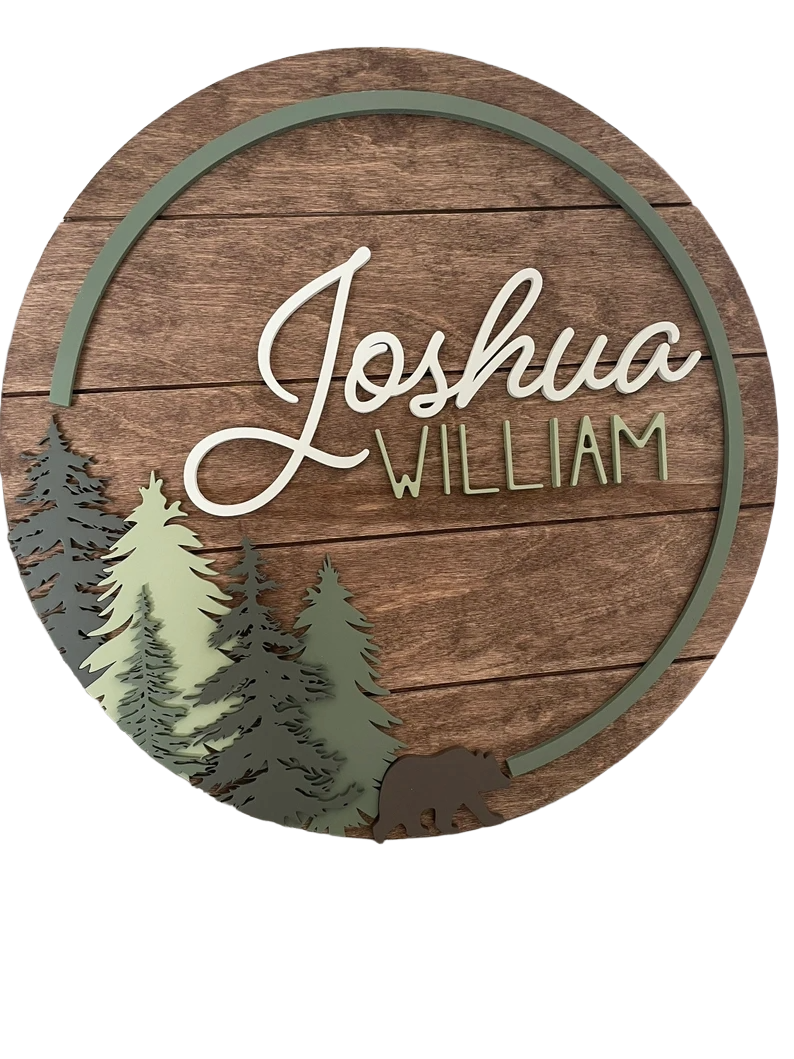 A personalized woodland nursery name sign featuring a green ring frame, layered forest trees, and a bear silhouette. Customized with your child’s name, this round sign adds a rustic woodland touch to any nursery.